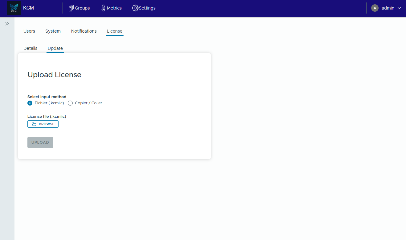 - File (.kcmlic): Click Browse, choose the license file from the email, and press Upload.