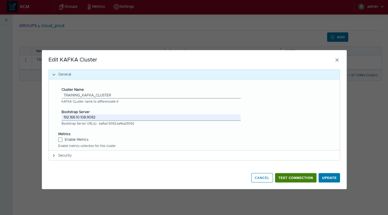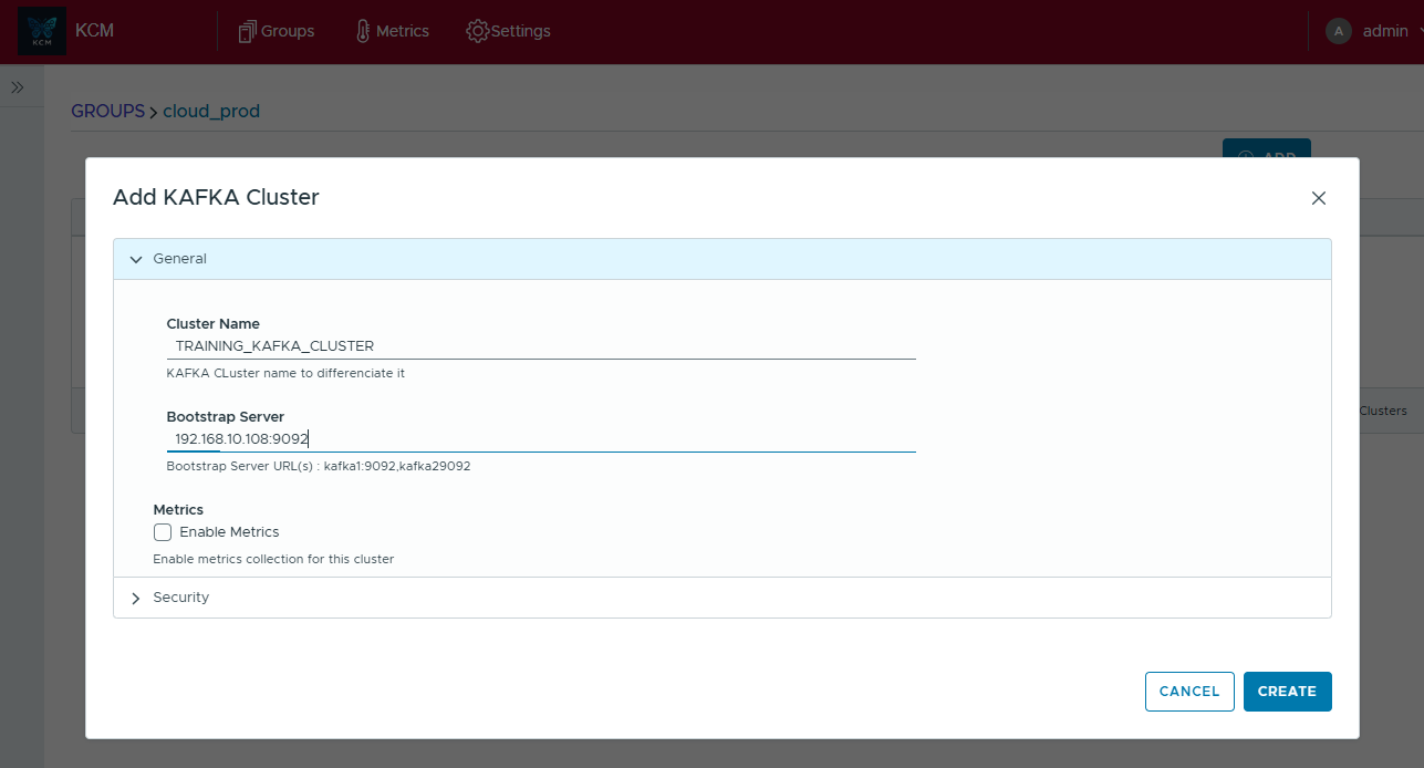 - In the General tab, give the cluster a descriptive name, list one or more bootstrap servers separated by commas, and enable metrics if you want KCM to collect built-in telemetry.