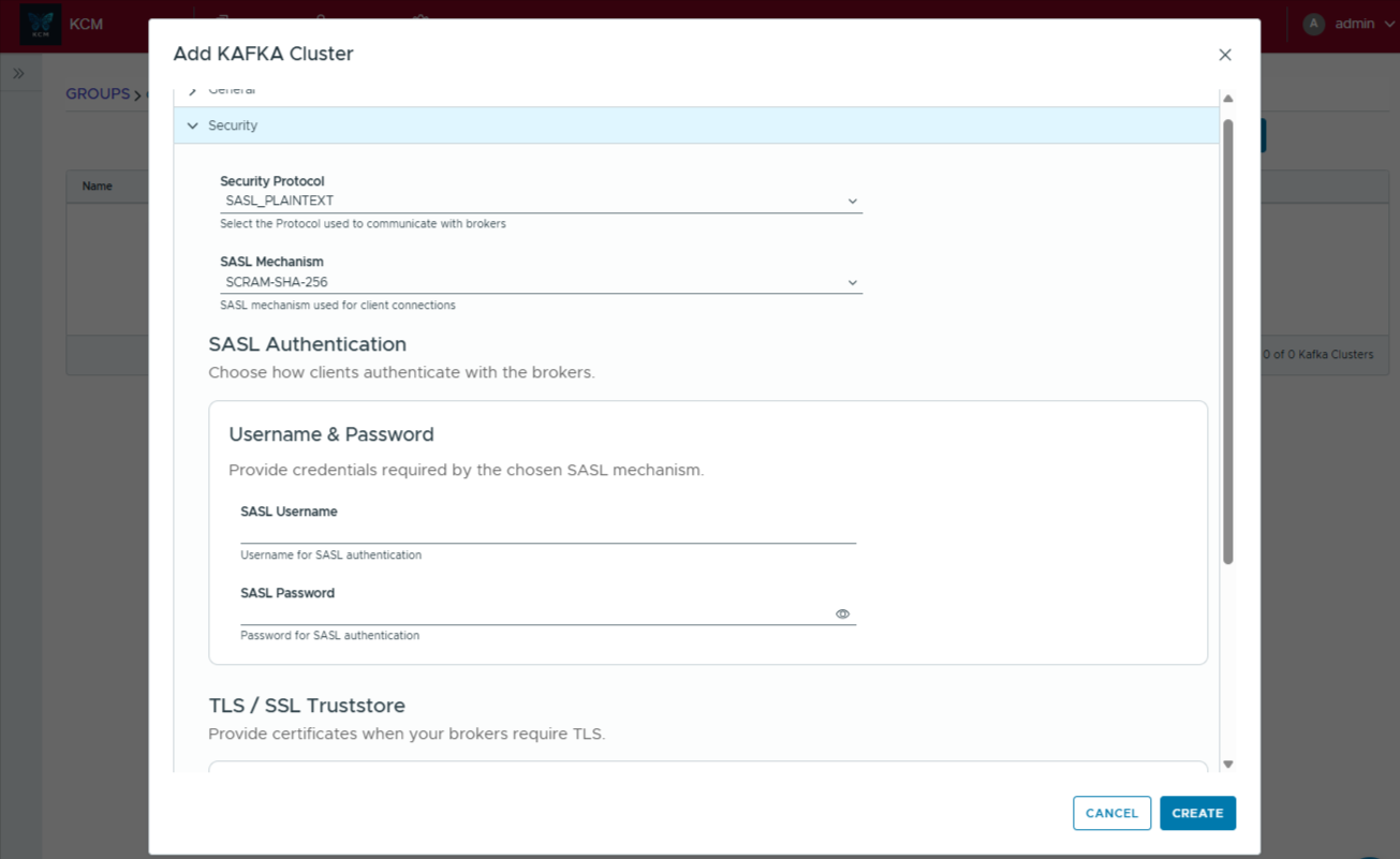 - Expand the Security section to pick your protocol (PLAINTEXT, SASL, TLS) and the matching SASL mechanism. Provide broker credentials and upload truststores as needed.