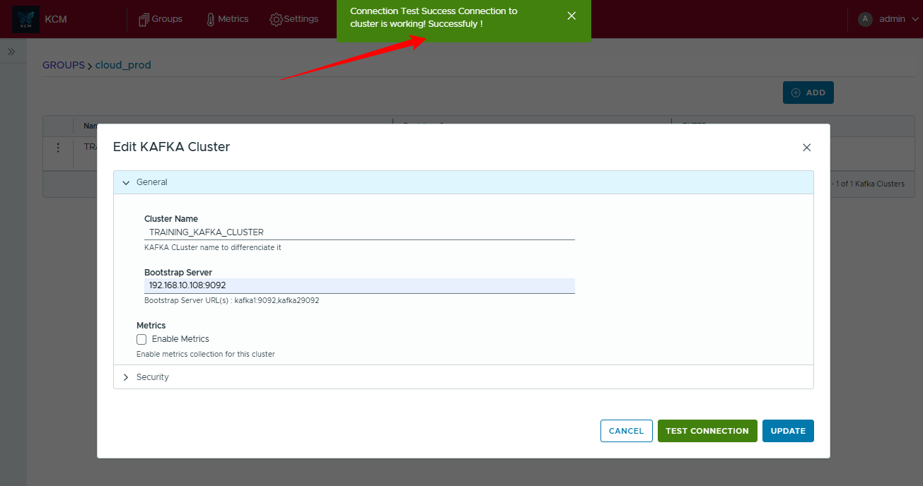 - Once created, use Test Connection to validate connectivity. A green success banner confirms KCM can reach the brokers with the provided details.