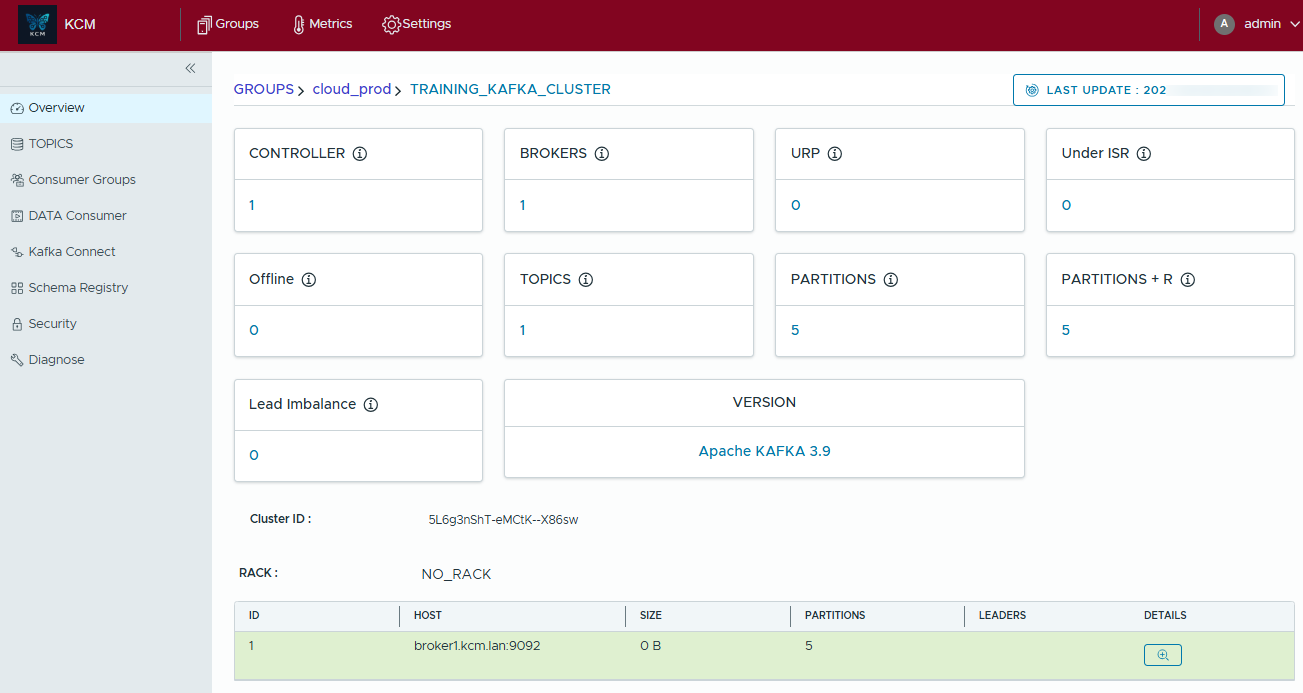 The Overview tab gives you an instant health snapshot: controller status, online brokers, topic counters, partition distribution, and the Kafka version running in your cluster.