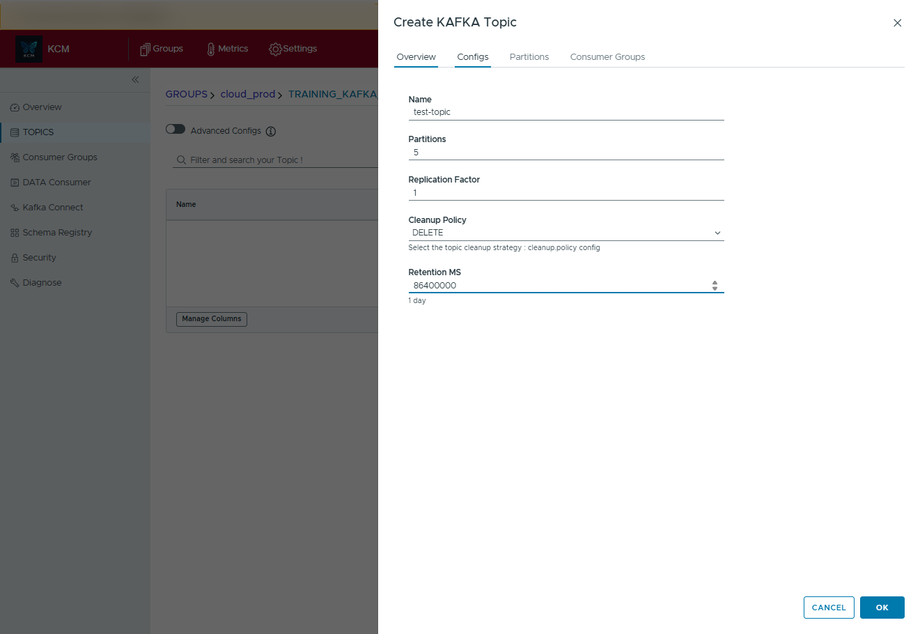 - Fill in partitions, replication factor, and optional configs.