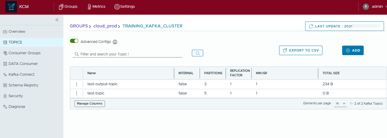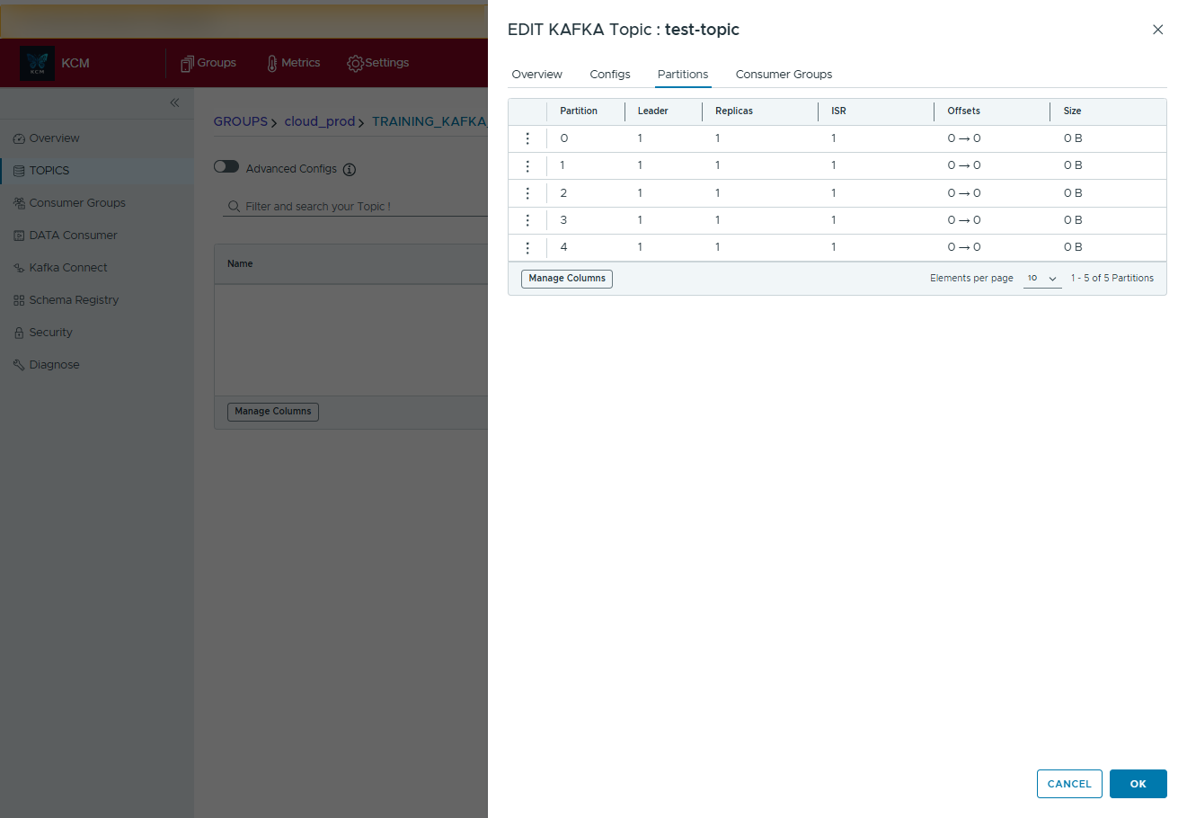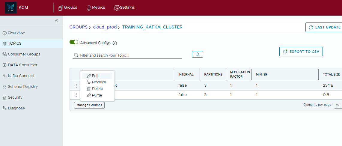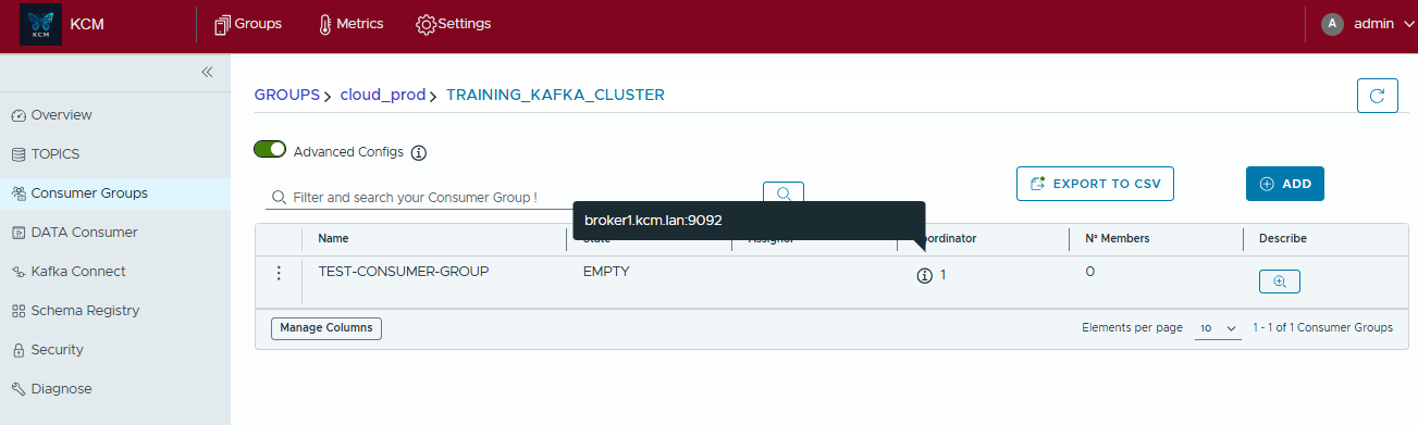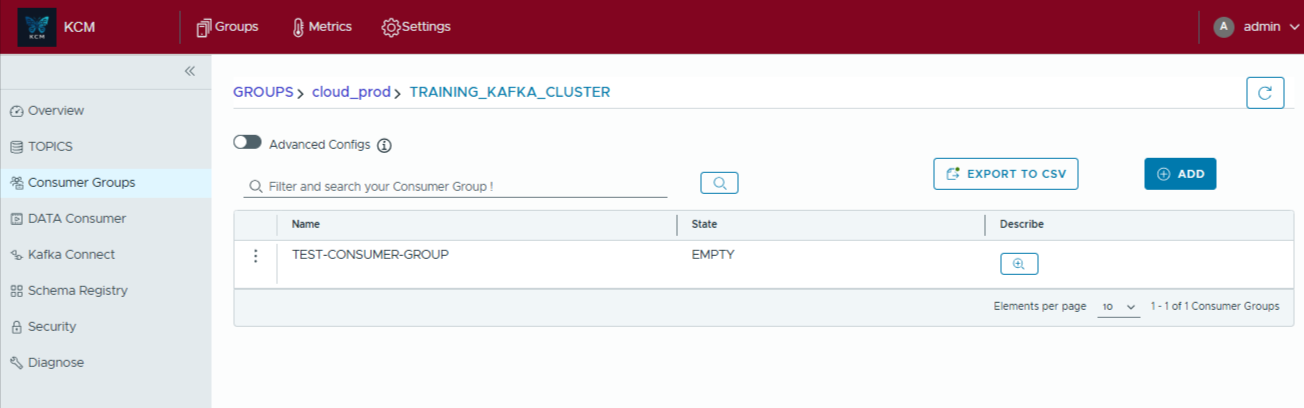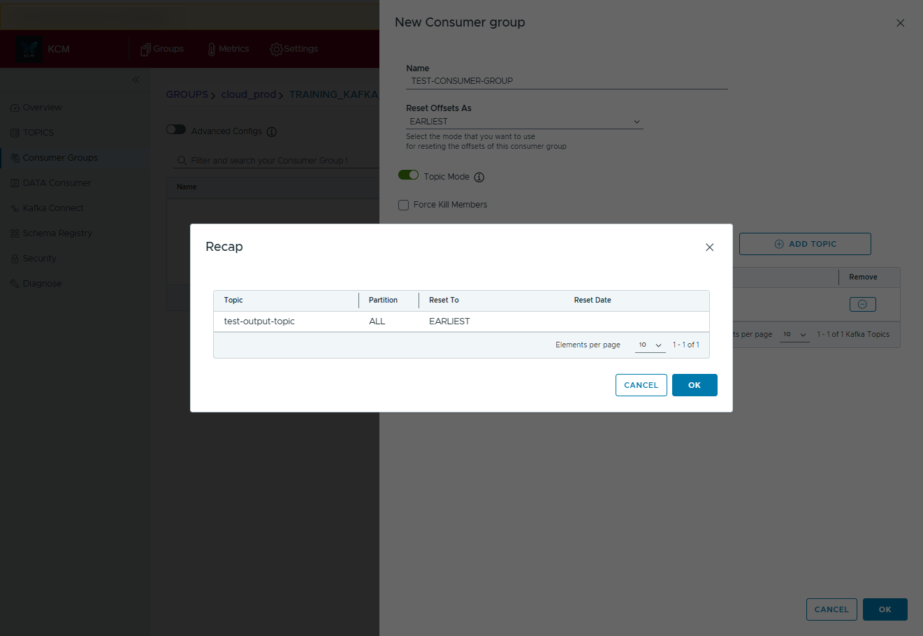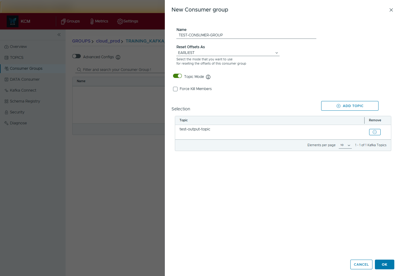 - Create test or production consumer groups and attach one or many topics in a single dialog.