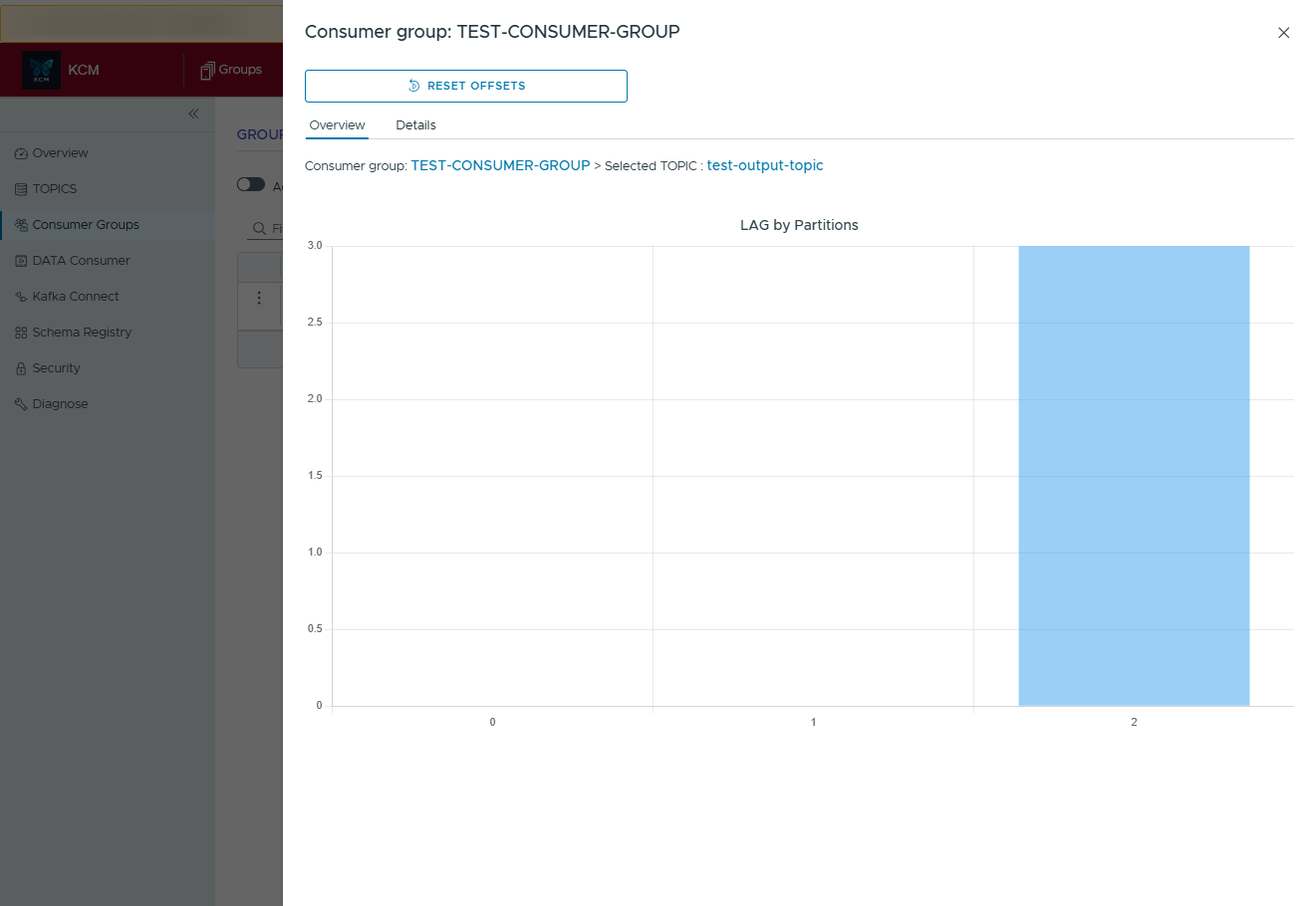 Monitor consumption at the group level, from creation through ongoing lag tracking. KCM lets you bootstrap new groups, reset offsets safely, and visualize how traffic is distributed across topics and partitions without touching the command line.