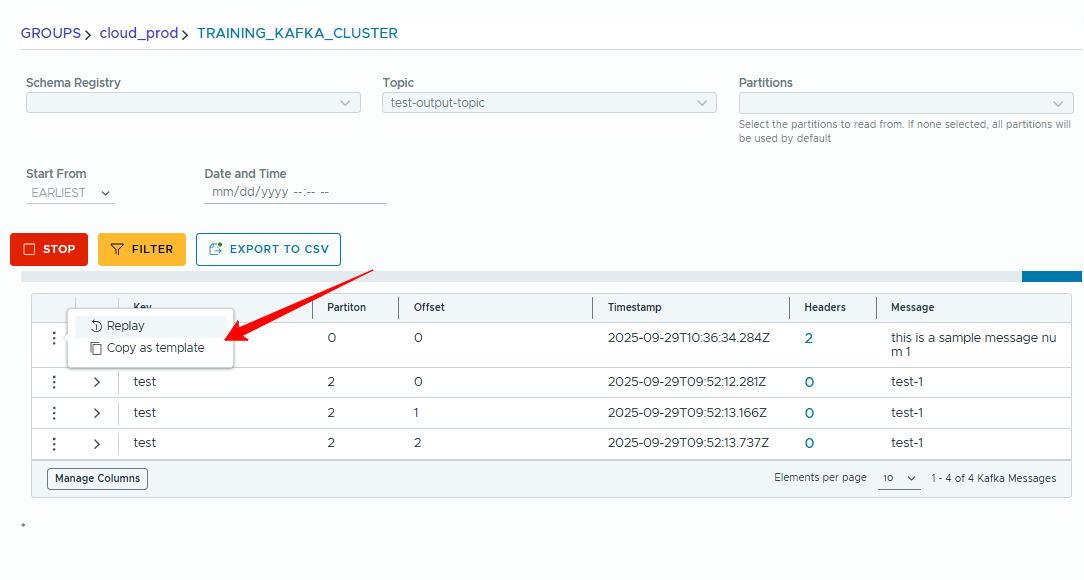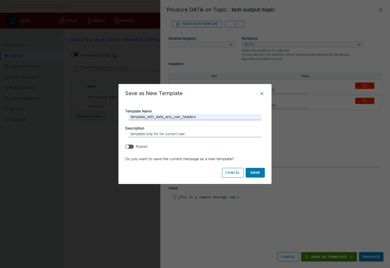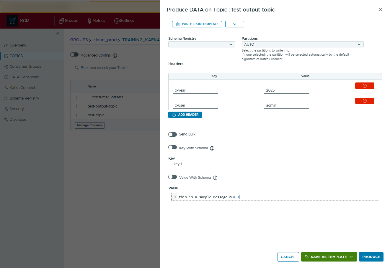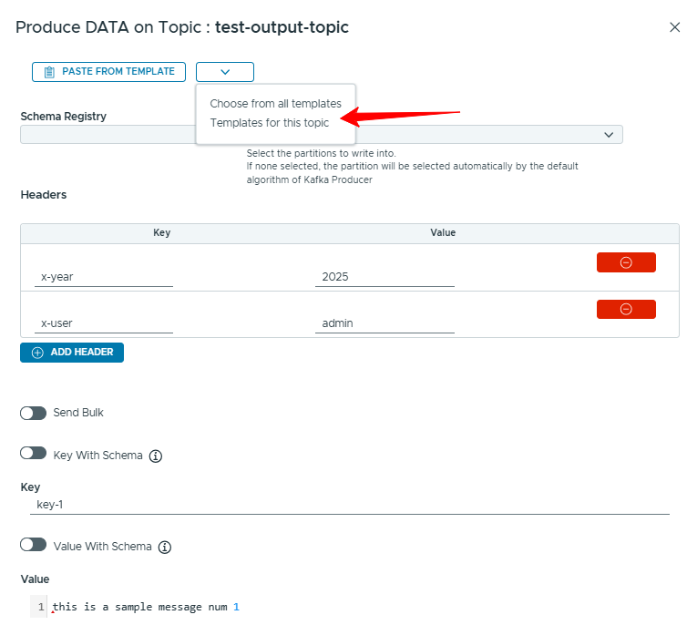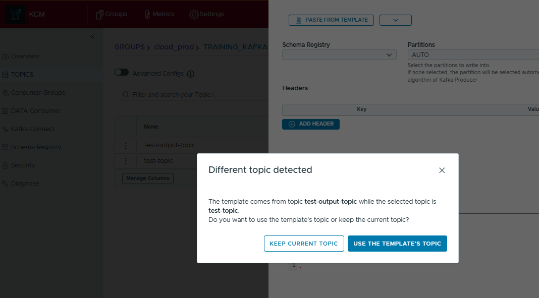 - Select the template you want and press Use this template. KCM injects the saved headers, key, value, and schema settings.