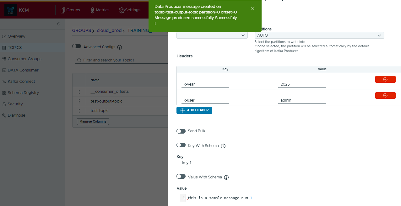 - Click Produce to send the record. A green toast confirms the partition and offset that were written.