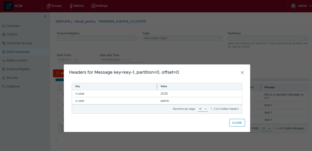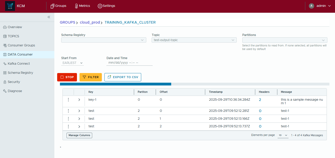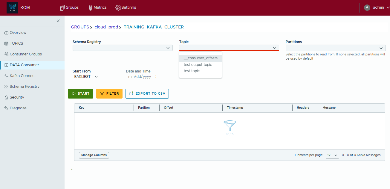 - Open Data Consumer, pick the cluster and topic you want to inspect, and optionally select partitions or a starting offset window.